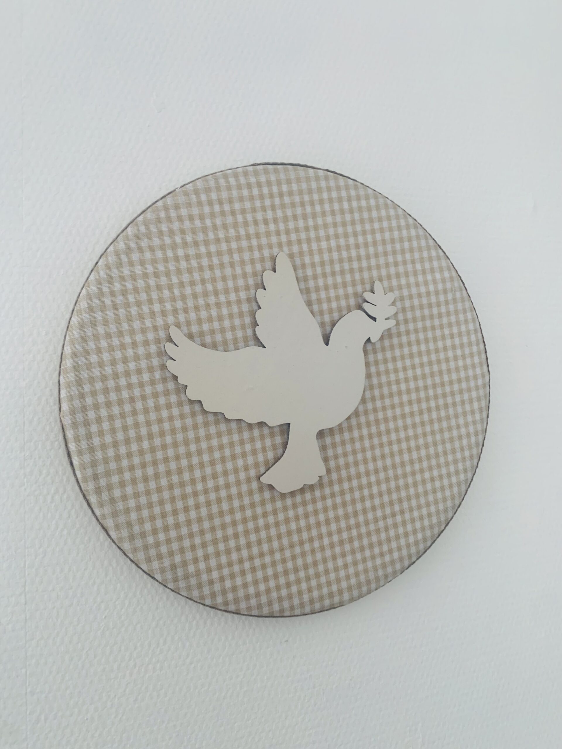 - 1 médaillon de 20cm de diamètre avec fond en coton imprimé au choix (avec une attache en métal à l’arrière)